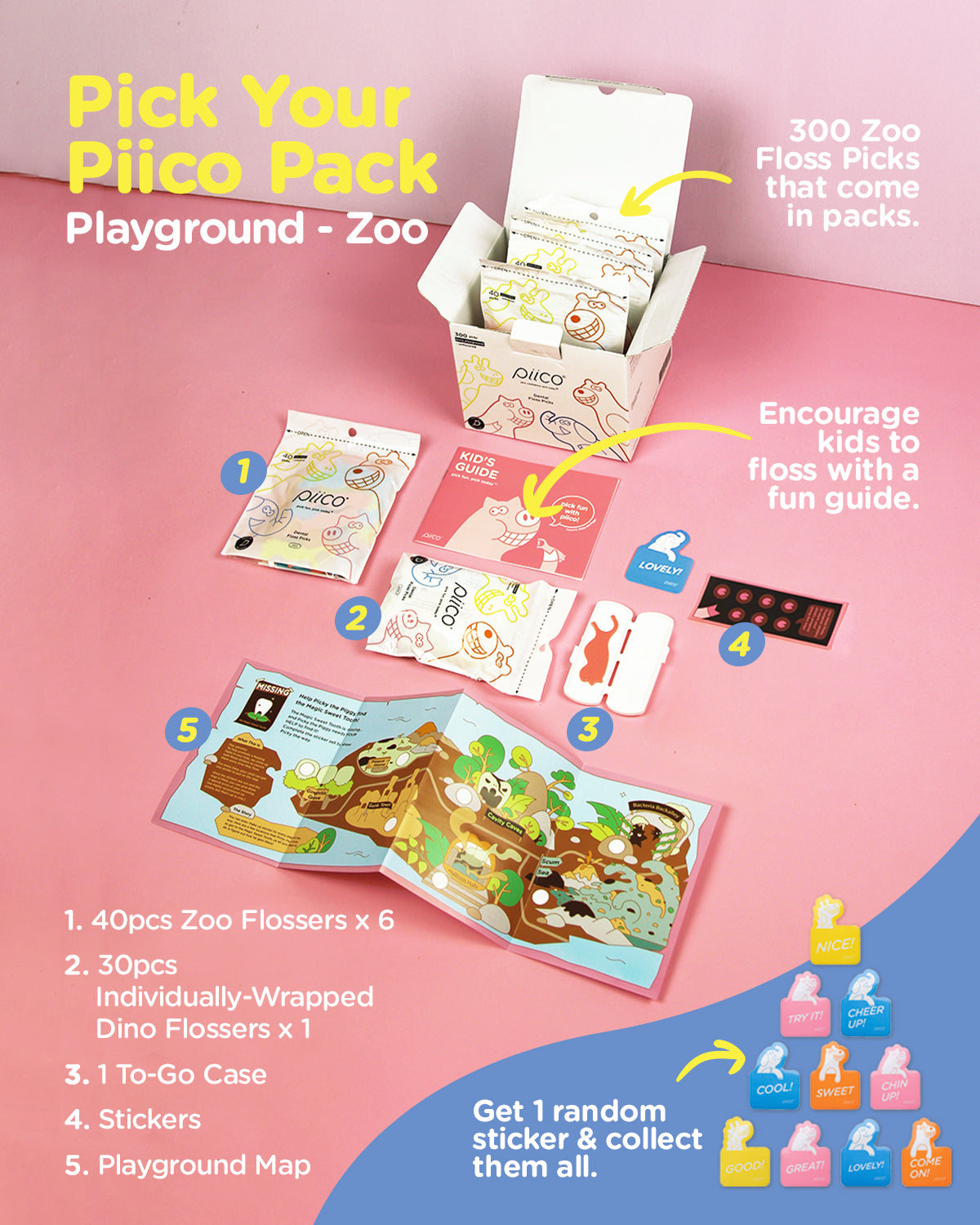 - 300 Kid-Friendly Flossers. Excite your children with a fun and colorful flossing routine! This bundle comes with 300 flossers inspired by zoo animals, with lots of perks to motivate kids to floss.